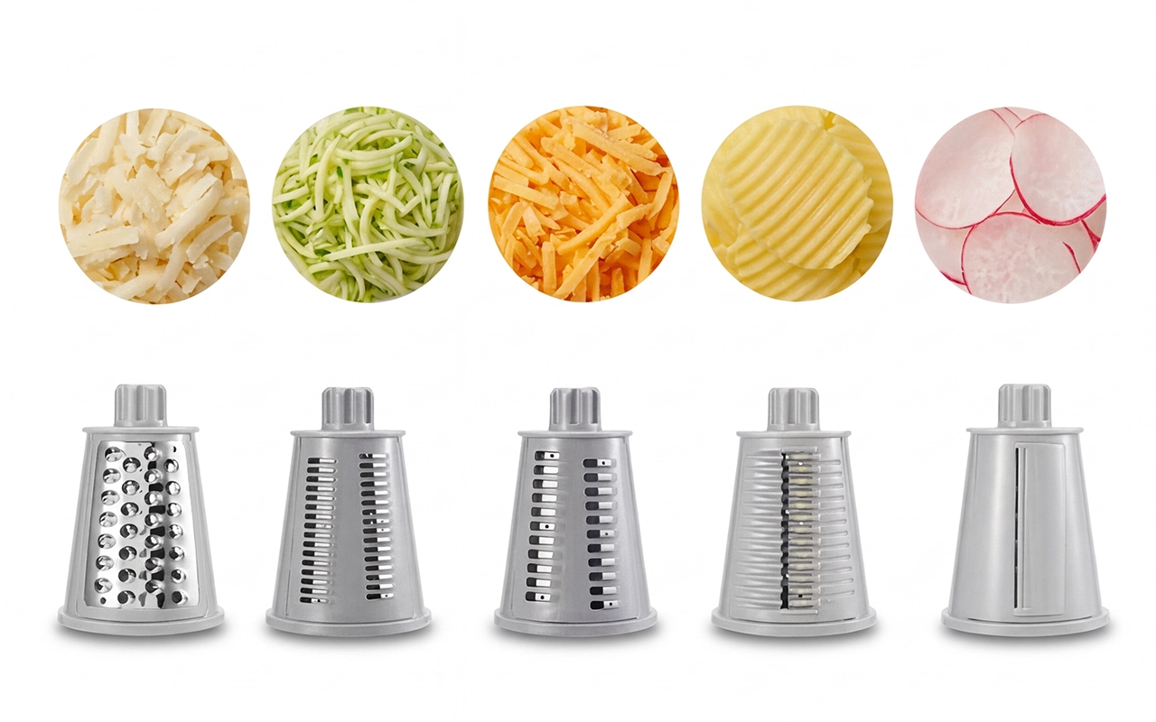 Swap five sharp drums for grating, slicing, julienning, or waffling. Prepare cheddar, coleslaw, courgette ribbons and dessert toppings in seconds.