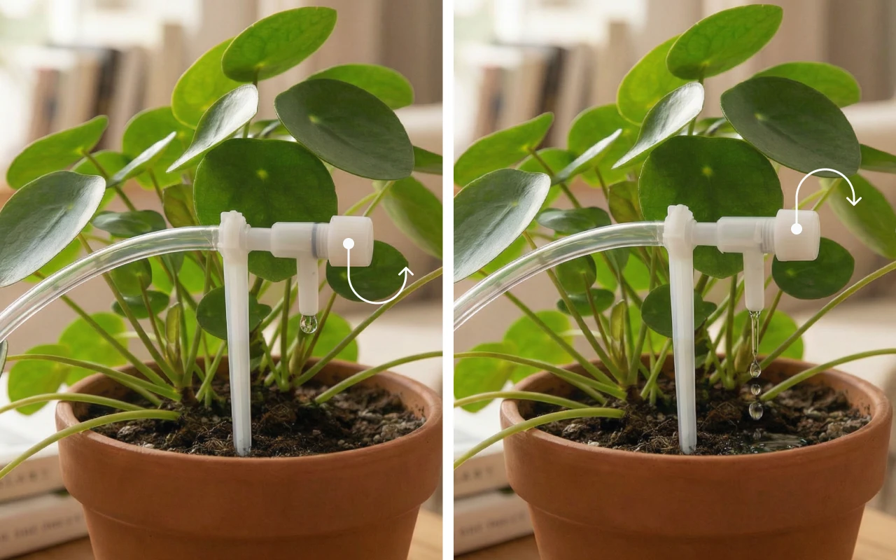 Twist the dial to set gentle drops. Each nozzle feeds roots evenly, reducing dry patches.