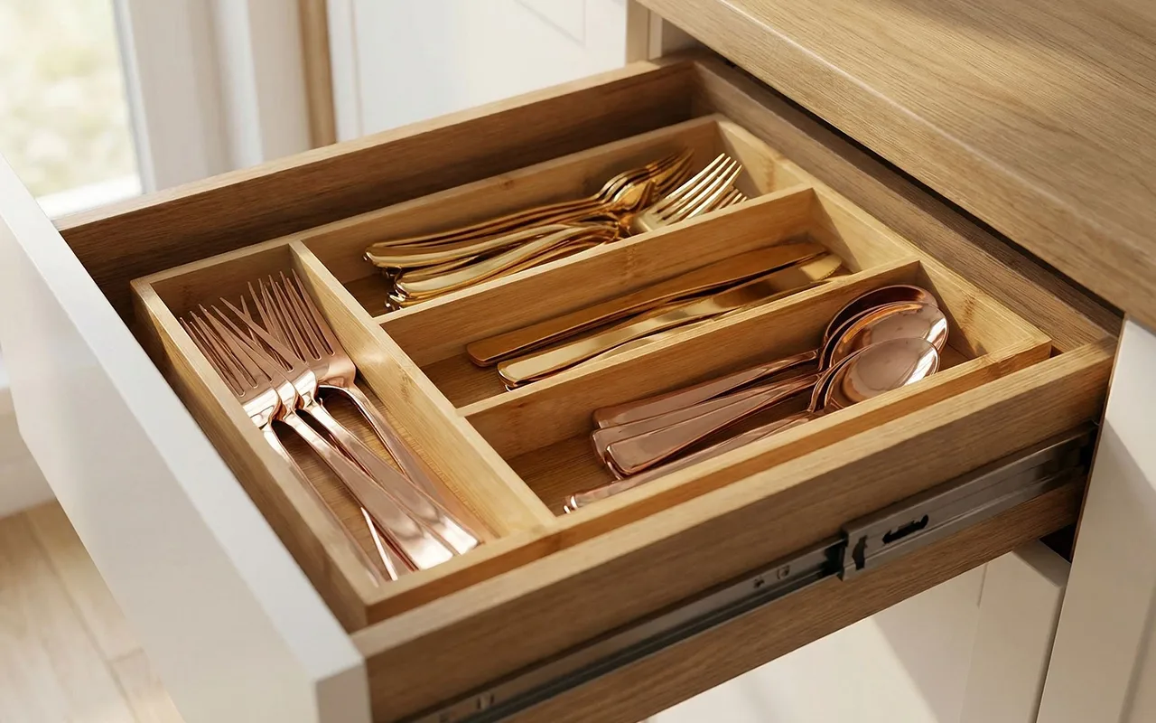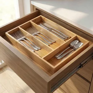 The smooth bamboo feels gentle on my good knives and serving forks. It doesn’t rattle like old plastic, and the natural look brings a bit of spa calm to the drawer.