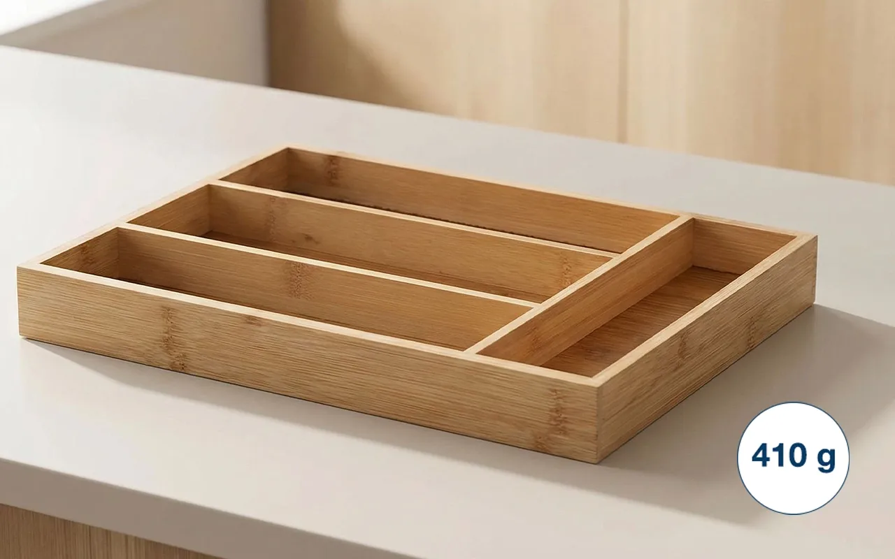 Nygex tray brings calm order to every busy kitchen. Smooth bamboo surface keeps utensils separated and always easy to reach. Natural structure adds quiet luxury inside ordinary storage spaces. Light construction lifts effortlessly for quick rinsing and drying.