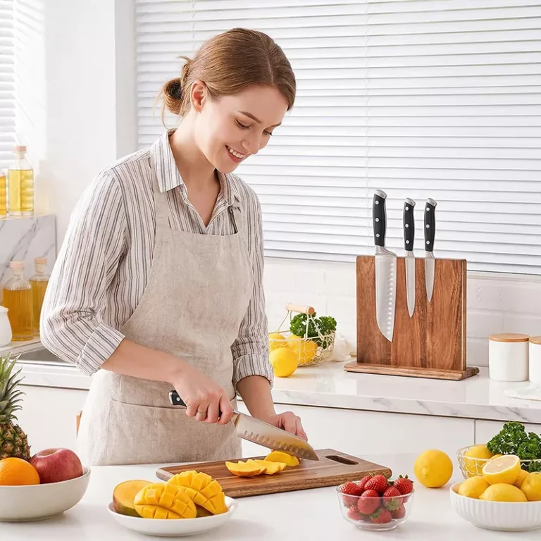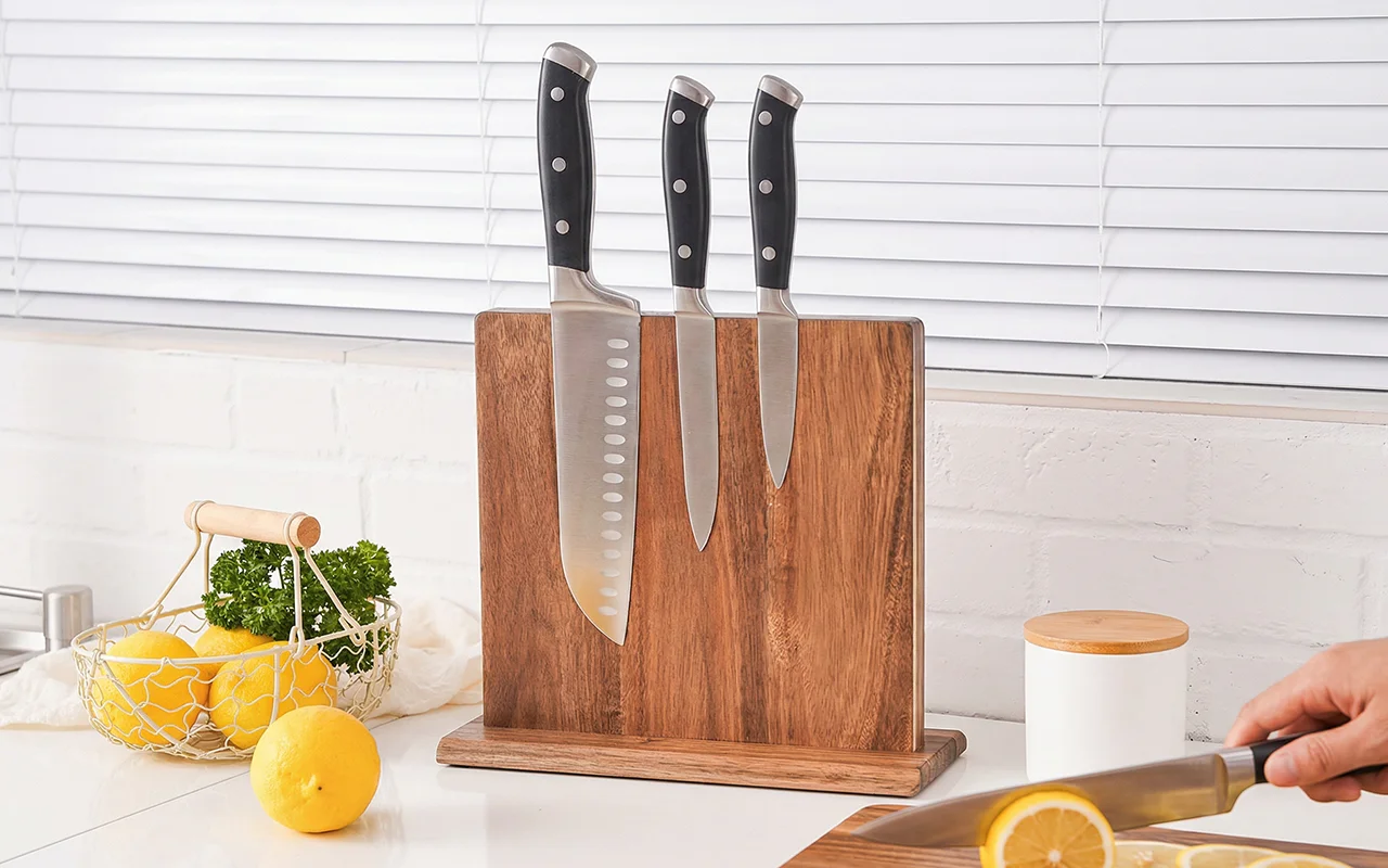 This block makes cooking calmer. All my blades stand straight, edges stay sharp, and the acacia wood matches our light cabinets nicely.