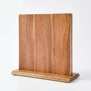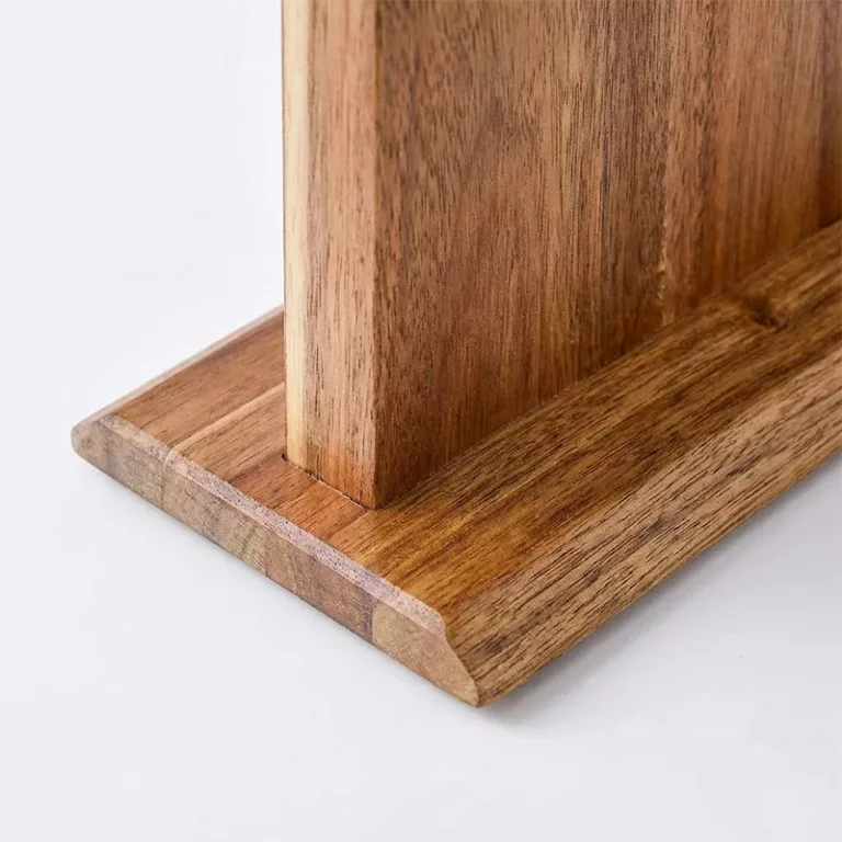 Nygex wooden stand instantly clears crowded drawers and messy worktops. Strong hidden magnets hold blades firmly while edges stay perfectly sharp. Smooth acacia surface resists scratches and simply wipes clean after cooking. Natural grain matches modern kitchens, creating a calm, organised preparation space.